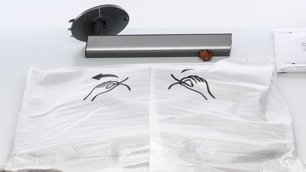 Die Montage des BenQ RD280U ist sehr einfach und kann direkt aus dem Kanton heraus erfolgen. Das Display liegt darin in einer Schutzhülle, die auf der Rückseite geschlitzt ist. In den unten stehenden Abbildungen haben wir den Bildschirm zur besseren Sichtbarkeit zunächst auf den Schreibtisch gelegt.