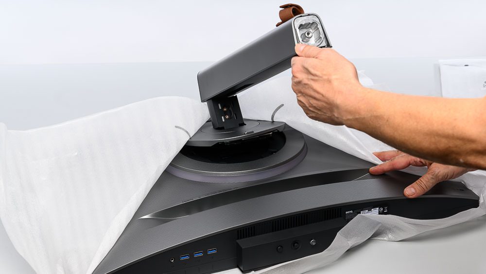 Optimalerweise montiert man zuerst die Bodenplatte auf dem Standbein. Anschließend muss man das Standbein nur noch auf der Display-Rückseite einklinken und kann dann den Monitor bequem aus dem Karton heben und gleich auf den Schreibtisch stellen.
