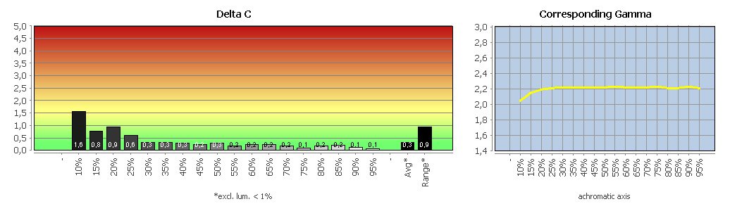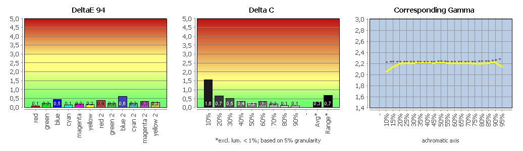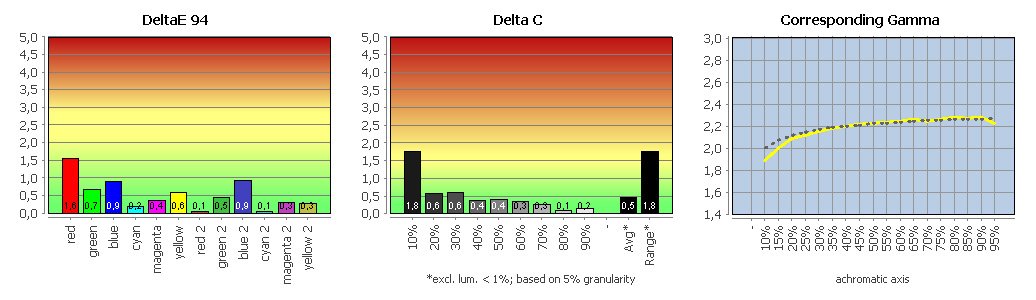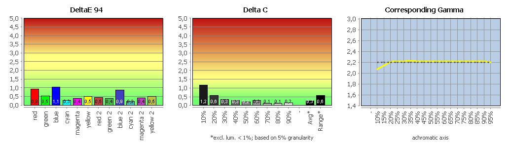 Über den sRGB- und Adobe-RGB-Modus können wir wiederum fast ausschließlich positiv berichten. Die Graubalance ist weiterhin einwandfrei. Geringe Abweichungen in den bunten Farben zeugen von präzisen Farbraumtransformationen. Entsprechende Inhalte können damit bereits ohne weitere Maßnahmen sehr ansprechend auch in nicht Farbmanagement-fähigen Anwendungen wiedergegeben werden.