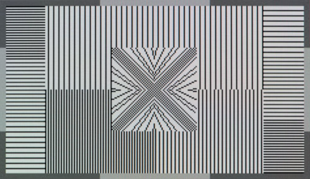 Die Schärfe bei nativer Auflösung ist erwartungsgemäß sehr gut. Aufgrund des ganzzahligen Teilers hat die Interpolation bei der Full-HD-Auflösung 1080p besonders leichtes Spiel. Bei 1280 x 720 sieht man, dass die notwendige Pixelvergrößerung hauptsächlich durch zusätzlich eingefügte graue Bildpunkte bewirkt wird. Dies führt zu etwas fetteren Konturen mit leichtem Unschärfe-Eindruck. Farbsäume treten nicht auf.