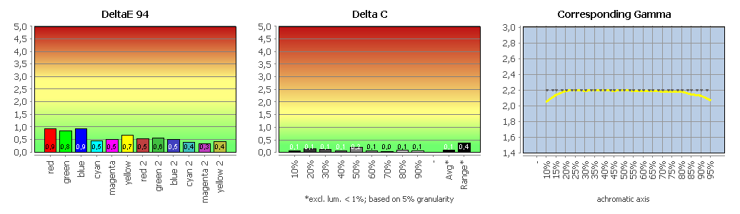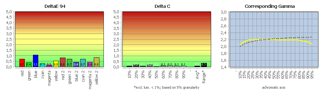 Ohne Fehl und Tadel sind dafür wieder die Abweichungen bei den Buntfarben (Delta-E94-Average: 0,66; Delta-E94-Maximum: 2,33). Das sind durch die Bank ausgezeichnete Werte.