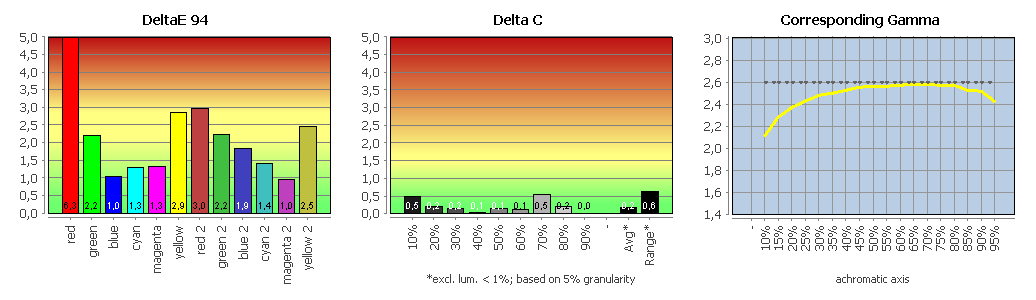 Die Erläuterungen zu den folgenden Charts haben wir für Sie zusammengefasst: Delta-E-Abweichung für Farbwerte und Weißpunkt, Delta-C-Abweichung für Grauwerte, und Gradation.