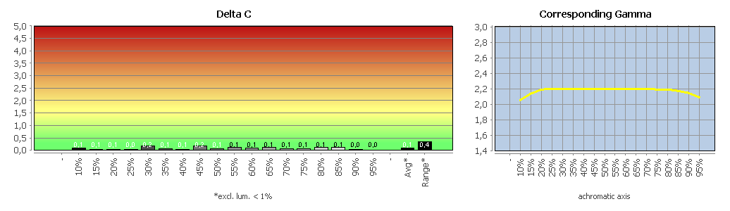 Im sRGB-Modus ist die Graubalance nahezu unverändert exzellent. Die Farbtemperatur liegt mit 6500 K exakt beim Soll. Das Gamma ist im Durchschnitt mit 2,17 zwar nur minimal zu niedrig, den Normverlauf des sRGB-Farbraums kann der Gammaverlauf aber nicht korrekt nachbilden.