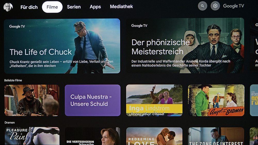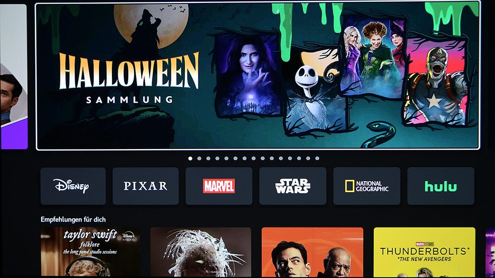Doch der Reihe nach: Nach dem ersten Einschalten öffnet sich ein Installationsmenü, wie wir es von TV-Geräten kennen, das einen Schritt für Schritt durch die Ersteinrichtung führt. Nach der Spracheingabe (in unserem Fall Deutsch) wird der Projektor mit dem Netzwerk verbunden. Anschließend erfolgt die Anmeldung in unserem Google-Konto. Sofort stehen uns alle Apps zur Verfügung. Sogar die Passwörter werden übernommen, sodass wir Disney+ starten können, ohne uns dort erneut anmelden zu müssen. Sehr gut!