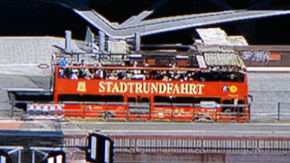 Grafiker und Fotografen profitieren gleichermaßen von der exzellenten Farbdarstellung, weil Bildwerke originalgetreu projiziert werden. Landschaften, Porträts und vor allem Schwarz-Weiß-Aufnahmen sehen umwerfend aus. Bei genauer Betrachtung sehen wir aber auch die leichten Auflösungsverluste, die durch das Weitwinkelobjektiv entstehen. So werden die vertikalen Streben der Brücke vor dem Doppeldecker nicht ganz gleichmäßig abgebildet. Die Personen im Bus und das Faltdach erscheinen wiederum realistisch. Der Schriftzug „Stadtrundfahrt“ wird vollständig und mit Originalfarben reproduziert. Ebenso lässt uns das Rot des Doppeldeckers anerkennend nicken. Der Asphalt ist herrlich grau, und die kleinen Applikationen auf dem Bus werden fein aufgelöst.