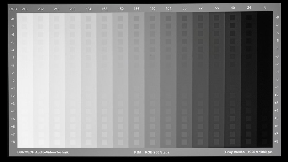 Alle 256 Graustufen eines jpg-Testbildes werden dargestellt. Der für HDTV-Filme relevante Wertebereich 16 (Schwarz) bis 235 (Weiß) wird von unserem Testgerät vollständig reproduziert. Es laufen keine Inhalte im Schwarz zu, und es überstrahlt nichts ins Weiß.