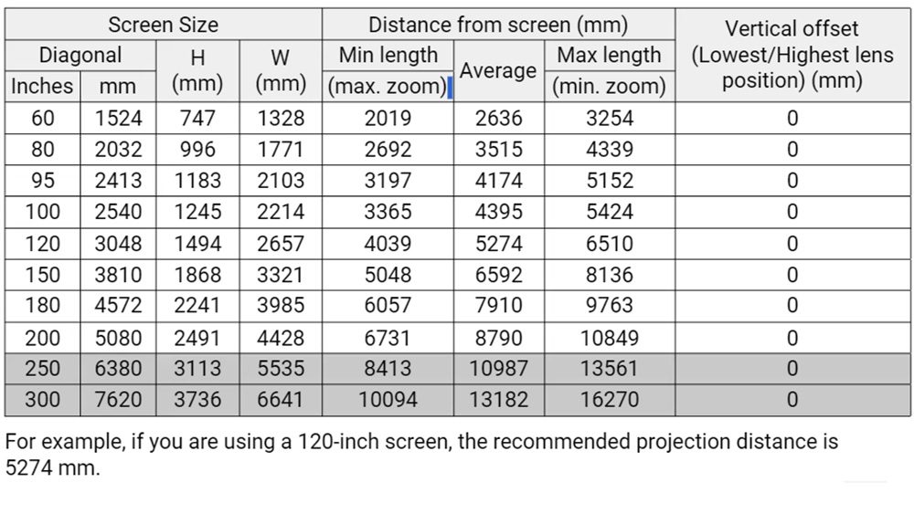 Die nachfolgende Distanztabelle zeigt die Aufstellungsmöglichkeiten detailliert für die Projektion im 16:9-Format.