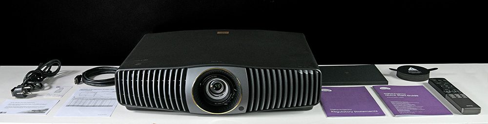 Der BenQ W5800 wird gut geschützt in einem puristisch anmutenden und riesigen Karton geliefert. Darin enthalten sind neben dem Beamer, der von einem stabilen Schaumstoffschutz eingefasst ist, eine Objektivabdeckung für den Transport, ein Stromkabel, ein HDMI-Kabel, eine Garantiekarte, eine Quickstart-Anleitung und ein Kalibrierungsprotokoll. Eine beleuchtete Fernbedienung mit Batterien komplettiert das Zubehör.