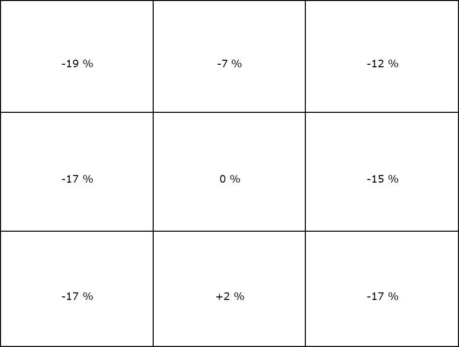 Wir untersuchen die Helligkeitsverteilung anhand eines weißen Testbildes, das an neun Punkten vermessen wird. Daraus berechnen wir die Helligkeitsabweichungen von der Bildmitte. Die Wahrnehmungsschwelle für Helligkeitsunterschiede liegt bei etwa 10 bis 20 %.