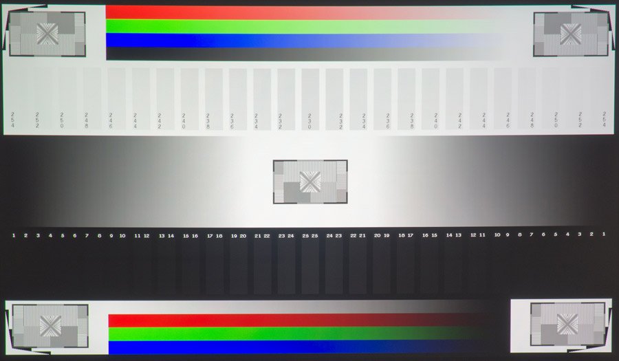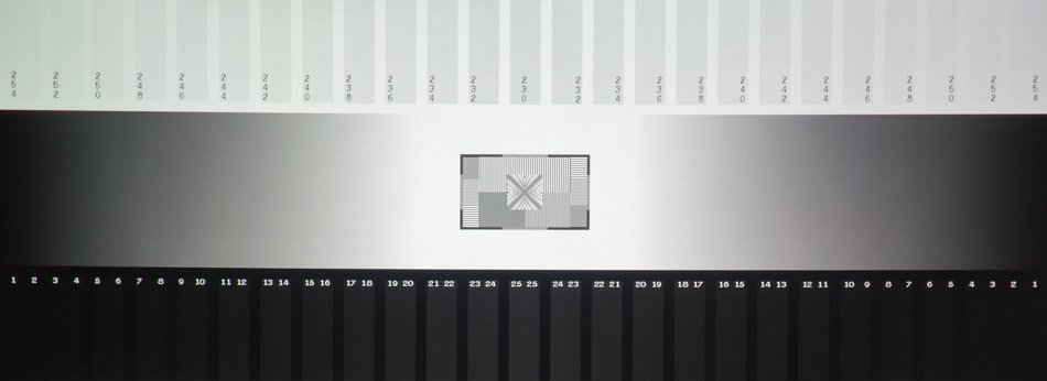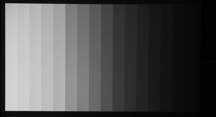 Wir haben die Testbilder für die Graustufenbeurteilung im Modus „Cinema“ zugespielt, der eine neutrale Farbdarstellung bieten sollte, um in Filmen etwa Hauttöne natürlich wirken zu lassen.