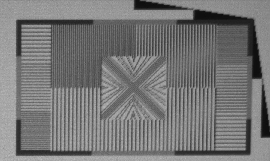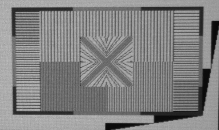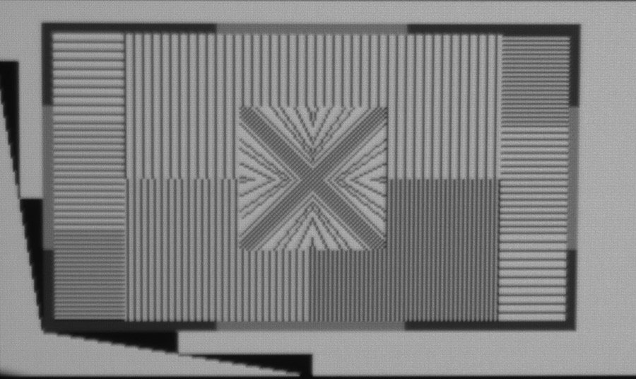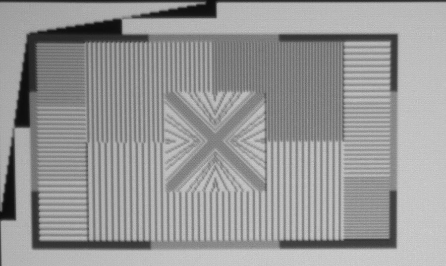 Das Testmuster wird in der Mitte natürlich mit der besten Schärfe dargestellt. Zu den Rändern fällt die Schärfe erwartungsgemäß ab, hält sich aber noch recht ordentlich. Die linke untere Ecke zeigt hierbei noch das beste Ergebnis und stellt selbst das sehr feine Muster innerhalb des Kreuzes noch gut dar. Den Schärfeverlust werden aber die wenigsten Anwender erkennen können, da man in der Regel nicht mit der Lupe direkt vor der Leinwand sitzt.