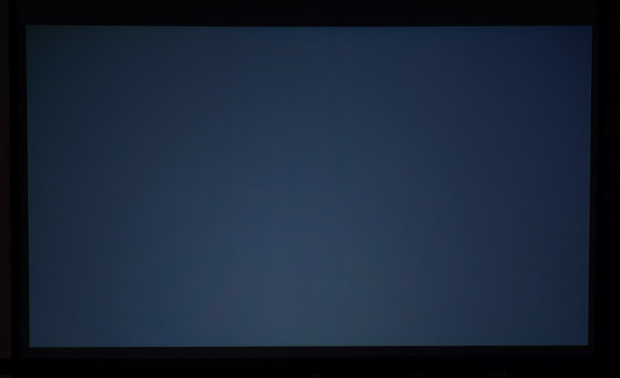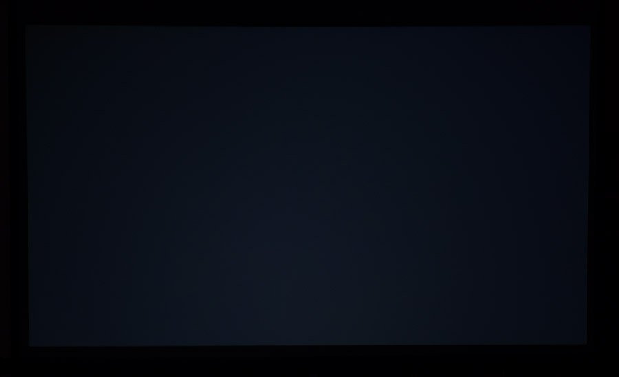 Das Schwarzbild stellt der BenQ X1300i erwartungsgemäß in einem sehr dunklen Ton dar. Hier machen sich die guten Schwarzwerte bemerkbar. Deutlich ist aber auch erkennbar, wo der stärkste Lichtstrom auftrifft, der genau mittig im unteren Bereich liegt. Dennoch kann man von einer guten Ausleuchtung sprechen.