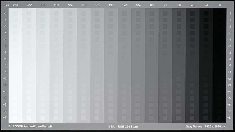 Alle 256 Graustufen eines jpg-Testbildes werden dargestellt. Der für HDTV-Filme relevante Wertebereich 16 (Schwarz) bis 235 (Weiß) wird von unserem Testgerät vollständig dargestellt. Es laufen keine Inhalte im Schwarz zu, und es überstrahlt nichts ins Weiß.