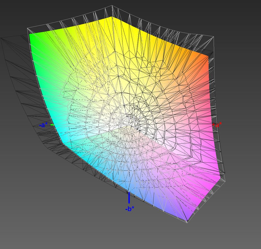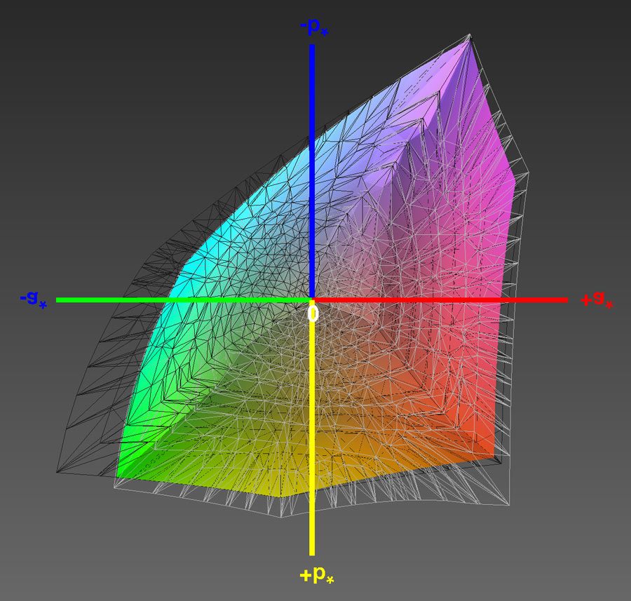 Der erzielte Farbumfang erlaubt ein farbsicheres Arbeiten im sRGB- und DCI-P3-Arbeitsfarbraum und hinreichend präzise Proof-Simulationen für den Offset-Druck auf gestrichenem Papier. Adobe RGB und ECI-RGB v2 werden letztendlich nicht hinreichend abgedeckt.