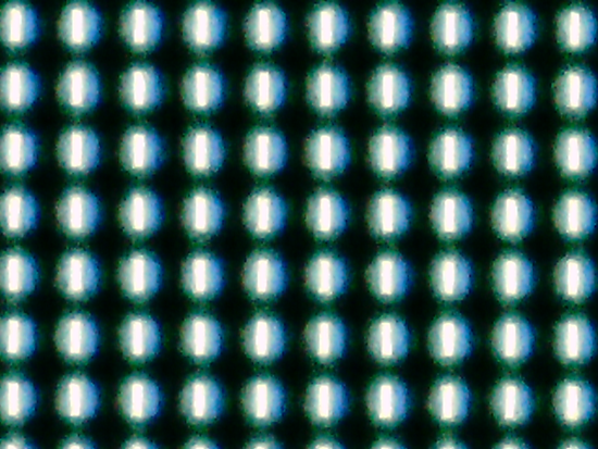 Mikroskopischer Blick auf die Subpixel, mit Fokus auf die Bildschirmoberfläche: Der Corsair Xeneon 27QHD240 besitzt eine matte Oberfläche mit winzigen, mikroskopisch sichtbaren Vertiefungen zur Diffusion. Im grauen Testbild zeigt der OLED-Monitor weiße Subpixel (die Farbpixel sind komplett dunkel geschaltet).