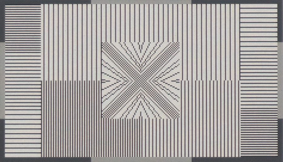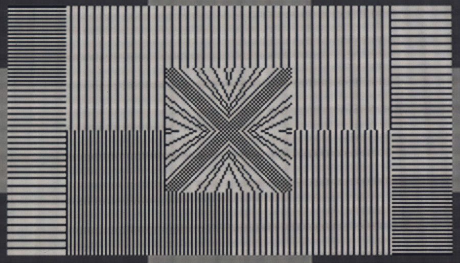 Die Schärfe bei nativer Auflösung ist erwartungsgemäß sehr gut. Aber auch die interpolierte Darstellung bei 1280 x 720 Bildpunkten gelingt dem Corsair Xeneon 27QHD240 hervorragend. Sicherlich kann man die zusätzlich eingefügten grauen Pixel durch die fetteren Konturen erkennen, doch wird selbst das fein aufgelöste Muster innerhalb des Kreuzes sehr gut reproduziert und lässt sich auch in seinen Nuancen erkennen.