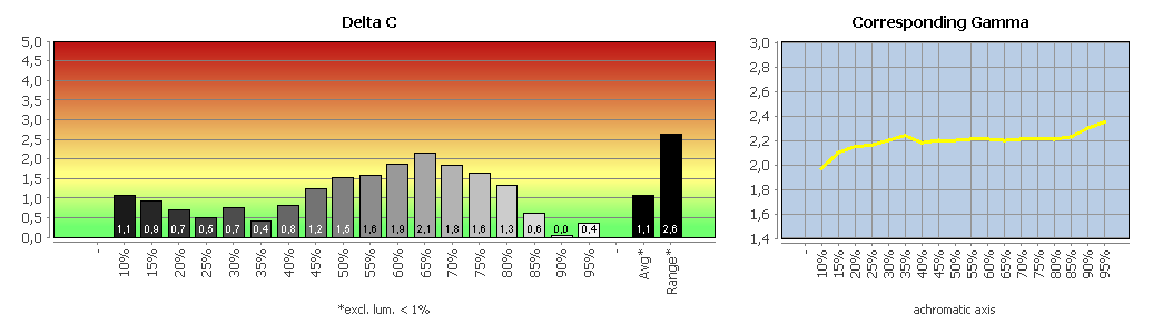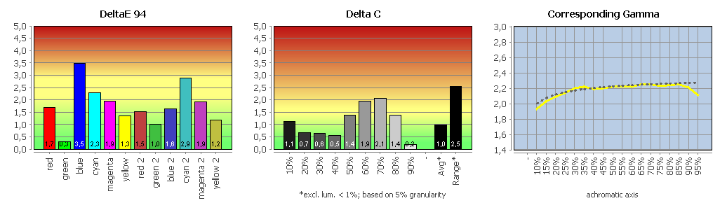 Die Erläuterungen zu den folgenden Charts haben wir für Sie zusammengefasst: Delta-E-Abweichung für Farbwerte und Weißpunkt, Delta-C-Abweichung für Grauwerte, und Gradation.