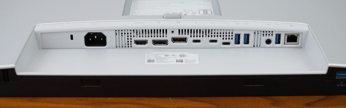 Der Dell U2724DE besitzt ein internes Netzteil. Im oberen Bereich des Rahmens befinden sich Lüftungsschlitze, allerdings erwärmt sich der Monitor kaum. Dort wurde auch der Umgebungslichtsensor positioniert, der das Umgebungslicht erkennt und die Helligkeit des Displays entsprechend anpasst.