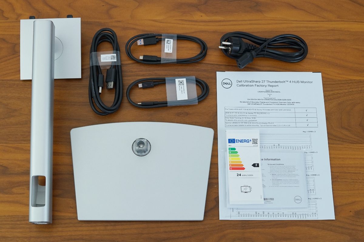 Neben dem Bildschirm selbst sind im Karton der Standfuß, das Standbein sowie Kabel für DisplayPort, Thunderbolt 4, USB (A auf C) und Strom enthalten, die bequem über die breite Seite entnommen werden können. Die USB-C-Kabel sind mit 100 cm etwas kurz geraten. Darüber hinaus liegen ein EU-Energielabel (Energieeffizienzklasse F), eine Kurzanleitung, ein Werkskalibrierungsbericht und eine Broschüre mit Garantie- und Service-Informationen bei.