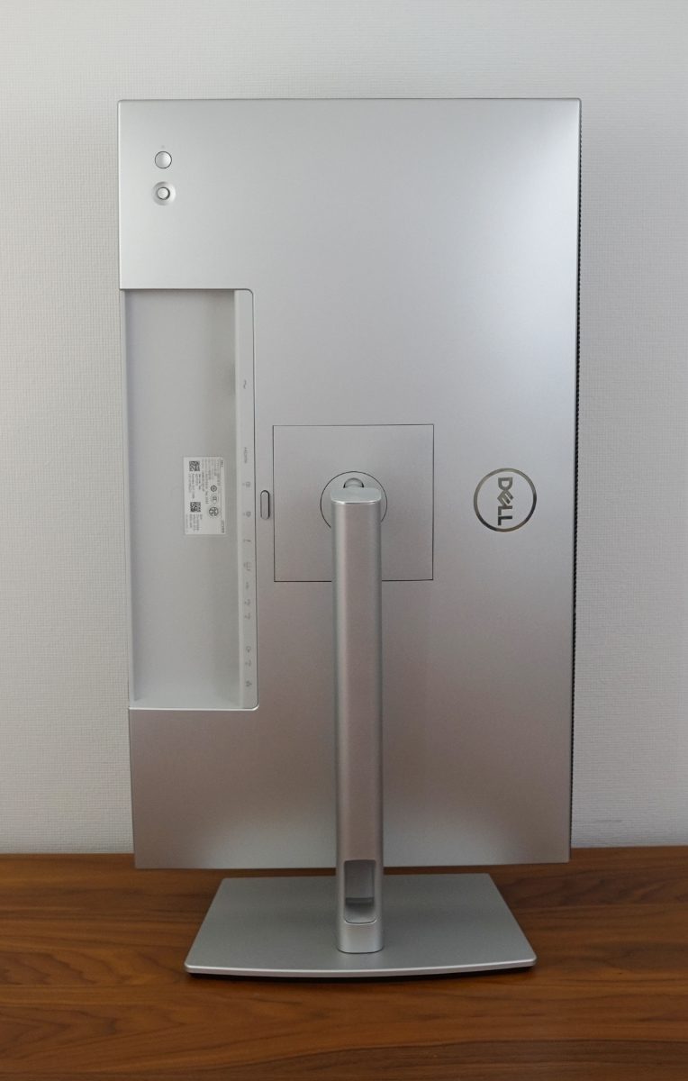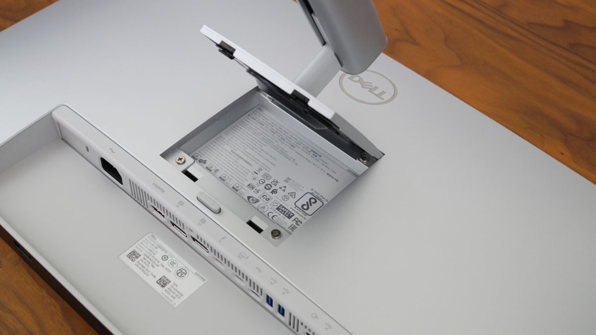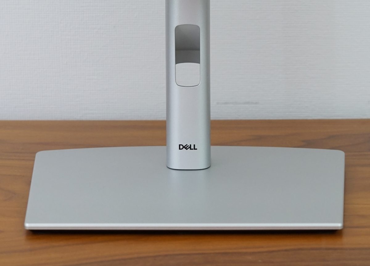 Anschließend wird das Standbein auf der Rückseite des Dell U2724DE in die dafür vorgesehene Öffnung gesteckt und nach unten gedrückt, bis es einrastet. Ein Druck auf den Schalter löst die Arretierung wieder.