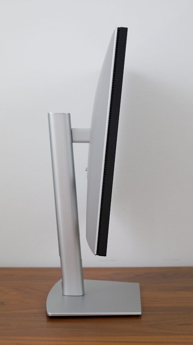 Ergonomisch bietet der Standfuß alle erforderlichen Funktionen wie eine seitliche Drehfunktion, eine Höhenverstellung, eine Neigefunktion und eine Hochkantdrehung (Pivot). Damit die Kabel nicht lose herunterhängen, ist im Standbein eine Öffnung vorhanden, die allerdings vorn und hinten versetzt ist. Die Kabel im hinteren Bereich weiter unten zu bündeln, ist eine an sich gute Idee, aber der Platz ist dadurch begrenzt.