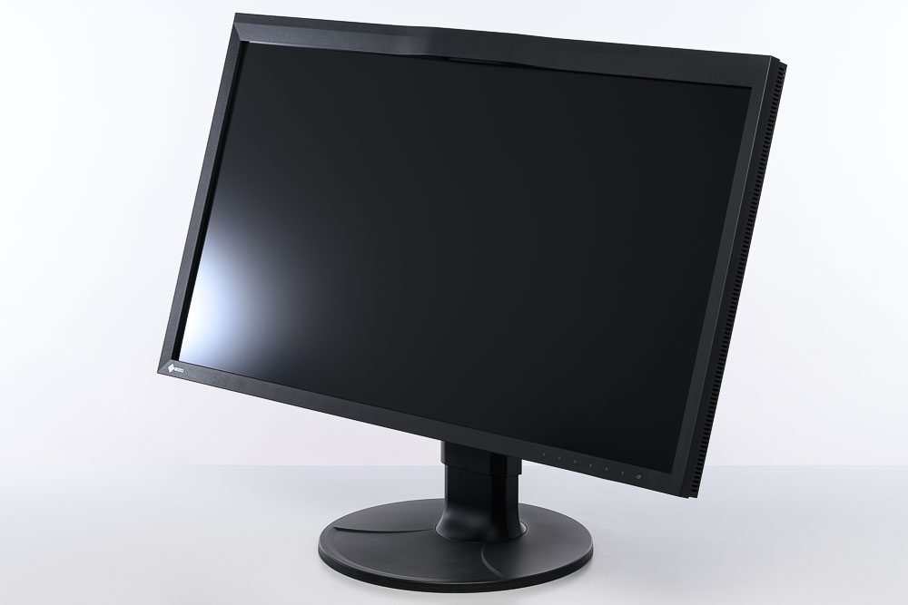 Auch bei der Drehfunktion zeigt sich der Monitor von seiner besten Seite: Während unsere Abbildungen jeweils eine 45°-Drehung nach links und rechts zeigen, ist tatsächlich eine nahezu vollständige Rotation um bis zu 344° möglich. In Verbindung mit der ebenfalls sehr großzügig einstellbaren Neigung von -5 ° bis +35° sind selbst komplexe Studio-Setups oder Multi-Monitor-Konfigurationen leicht einzurichten. Auf eine Pivot-Funktion verzichtet der EIZO CG3100X jedoch – Hochformat-Einsätze lassen sich nur über eine separate VESA-Halterung realisieren.