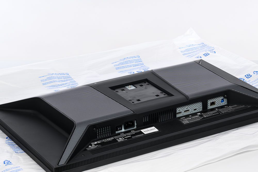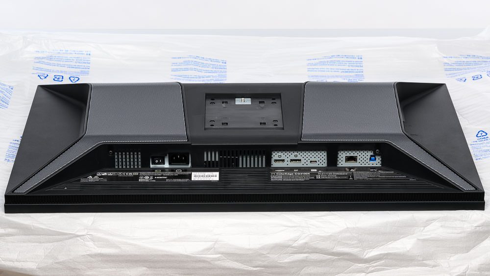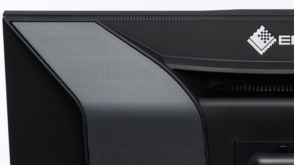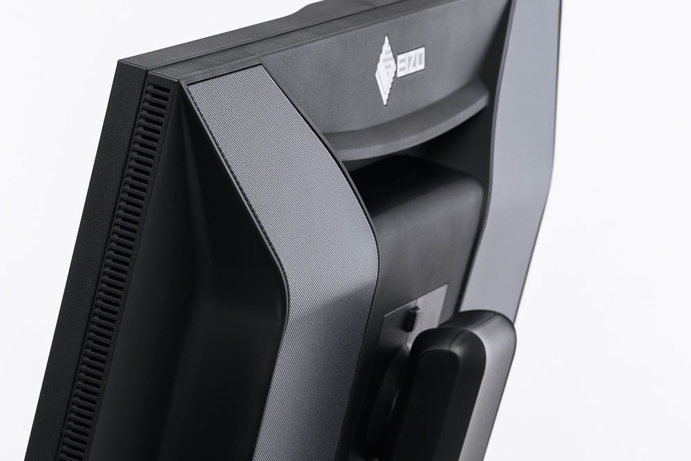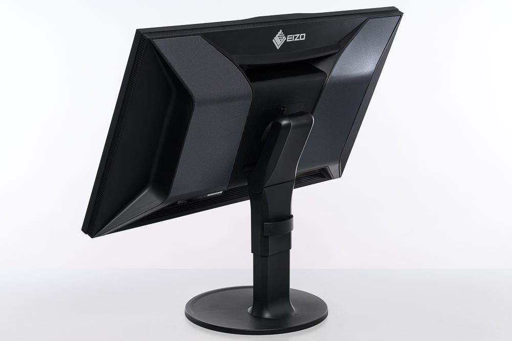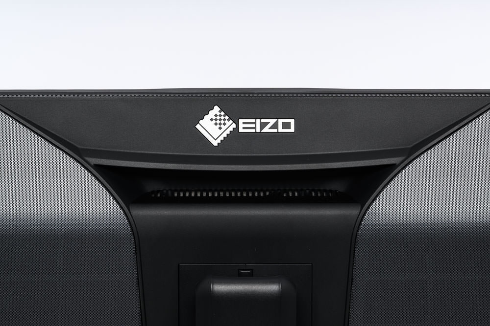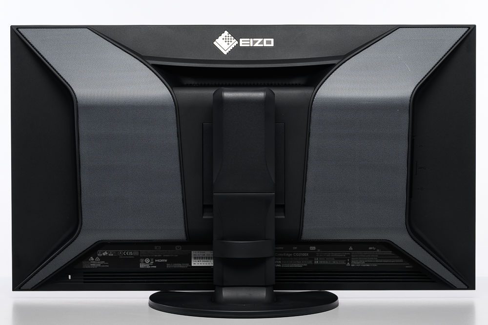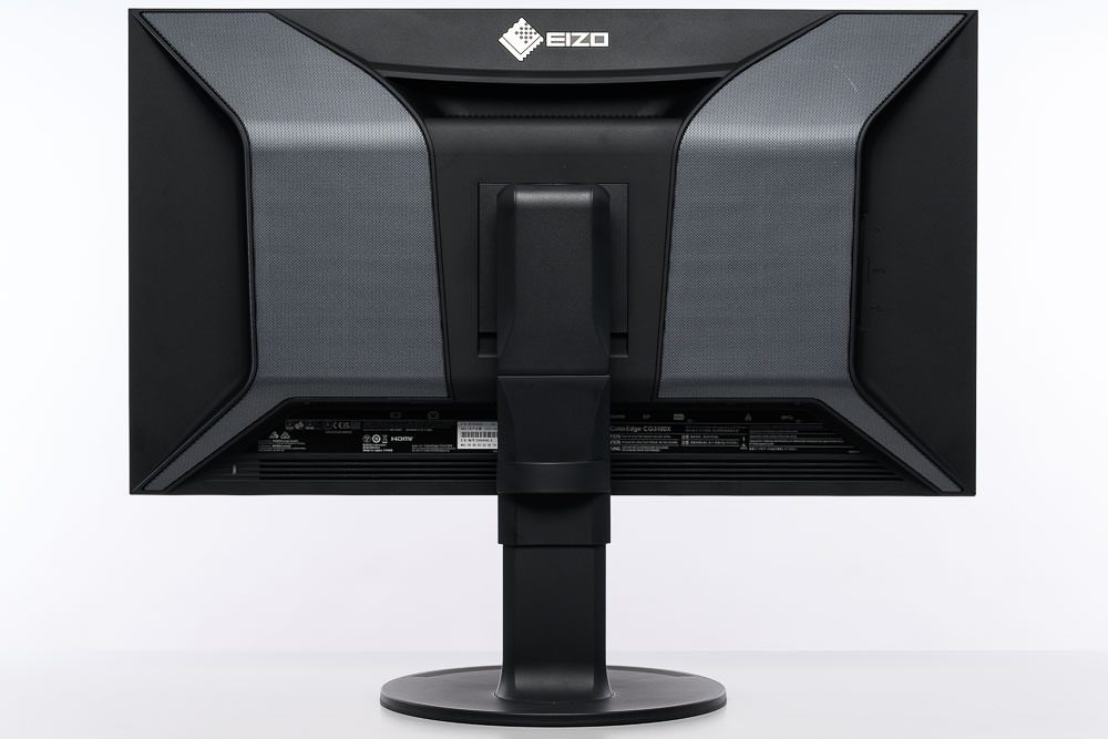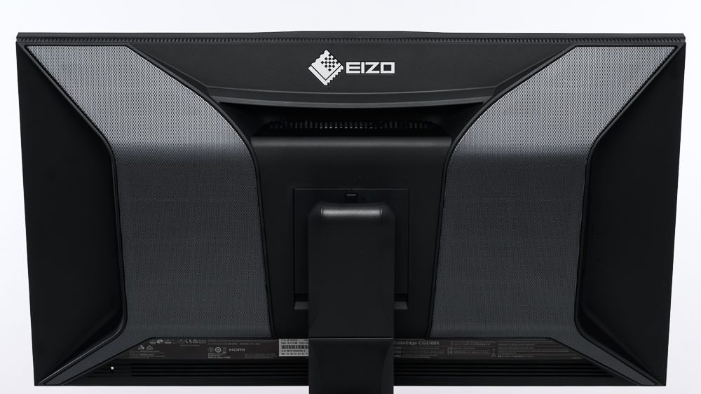 Rückseitig unterscheidet sich der EIZO CG3100X deutlicher von den kleineren CG-Modellen, bleibt aber klar Teil der aktuellen ColorEdge-Designlinie. Das Gehäuse ist größer und kantiger ausgeführt und wird von einer durchgehenden, grau abgesetzten Lochblende dominiert, die der erhöhten Wärme-Entwicklung des HDR-tauglichen 500-cd/m²-Panels und des integrierten Netzteils Rechnung trägt.