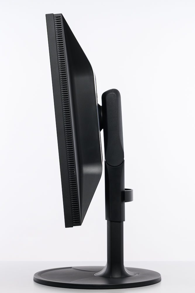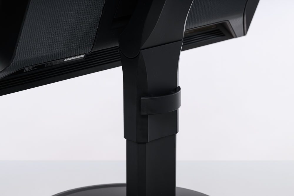 Auch die Kabelführung wurde gegenüber älteren Modellen weiter optimiert. Statt des früheren Kunststoff-Clips, der lediglich am Drehteller eingesteckt wurde, besitzt der EIZO CG3100X eine deutlich robustere Kabelführung direkt am Standbein. Diese Lösung wirkt nicht nur stabiler, sondern ermöglicht zusätzlich ein saubereres Kabelmanagement.
