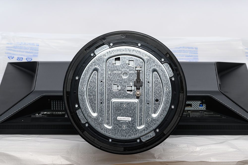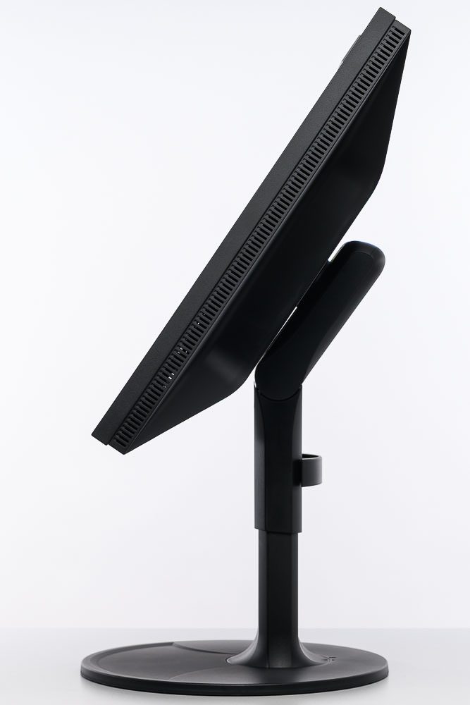Optisch zeigt sich das Feintuning des FlexStand-Systems auch beim EIZO CG3100X in mehreren Punkten. Der Drehteller ist nicht als einfache Scheibe ausgeführt, sondern besitzt eine dezent modellierte Mulde, deren Form sauber in das Standbein übergeht. Zusammen mit den abgeschrägten Kanten entsteht ein hochwertigeres Erscheinungsbild, das – trotz der Größe des Monitors – eine angenehm ergonomische Handhabung ermöglicht. Besonders praktisch ist dabei die wiedereingeführte Griffmulde oberhalb der Standbeinaufnahme. Sie erleichtert sowohl das Anheben des Monitors als auch das Feinjustieren der Höhe und erinnert an frühere, besonders funktionale Generationen der ColorEdge-Serie.
