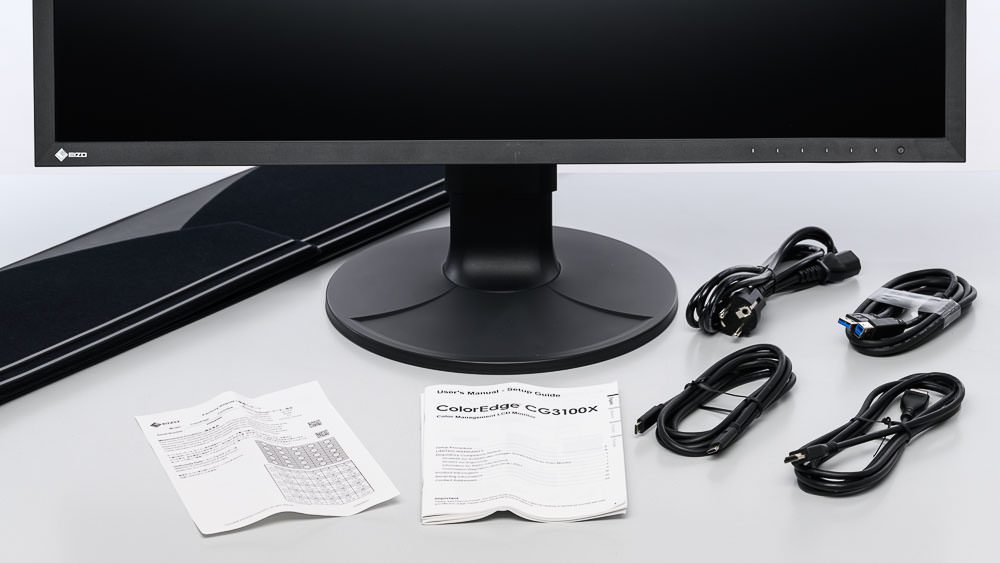 Im Lieferumfang des EIZO CG3100X befinden sich der Monitor selbst sowie Kabel für USB-C, HDMI, USB-A auf USB-B und Strom. Ein DisplayPort-Kabel liegt in dieser Preisklasse zwar nahe, gehört jedoch beim aktuellen Probanden nicht zum Standardzubehör – hier hätte der Hersteller aus Anwendersicht gern etwas großzügiger sein dürfen.