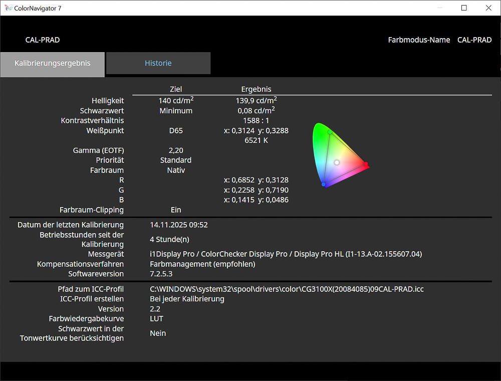 Für die nachfolgenden Messungen wurde der Monitor direkt aus dem ColorNavigator heraus kalibriert (Farbraum „Native“, Gamma 2,2, Farbtemperatur 6500 K, DUE „Uniformity“) und anschließend profiliert.