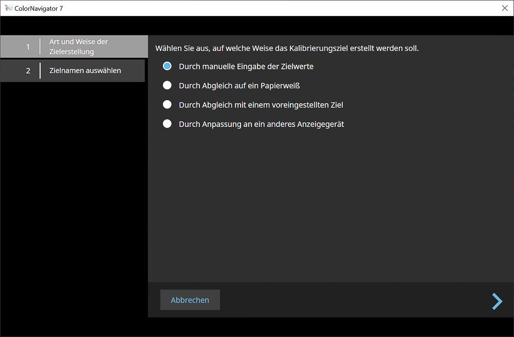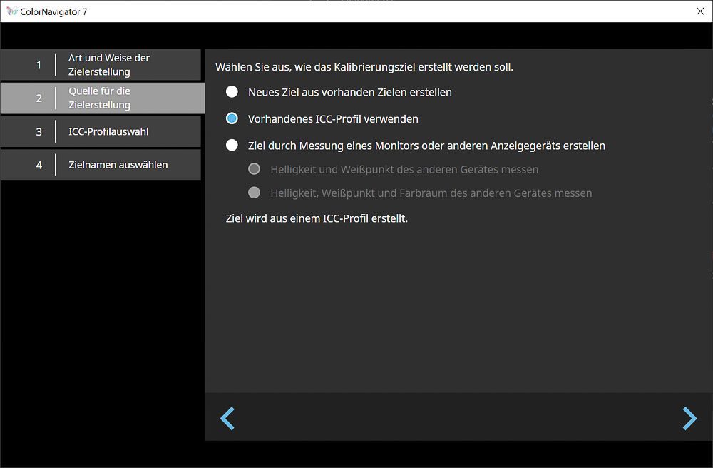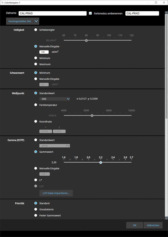 Im weiteren Verlauf zeigen wir exemplarisch, wie ein neues Kalibrierungsziel manuell definiert wird. Alternativ können bestehende Zielvorgaben angepasst, Messwerte direkt aus ICC-Profilen übernommen oder über eine Messung aus externen Kolorimetern generiert werden. Die Anwendung eines ICC-Profils demonstrieren wir später am Beispiel einer Farbraum-Emulation.