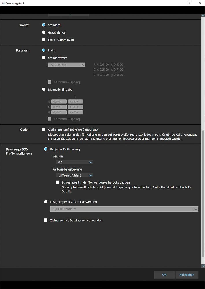 In einem Farbmanagement-fähigen Workflow empfiehlt sich meist die Kalibrierung auf Basis des nativen Farbraums des Monitors – für maximale Flexibilität. Alternativ stehen zahlreiche Standard-Farbräume zur Auswahl. Sollten sie nicht ausreichen, lassen sich die Primärfarben auch aus ICC-Profilen extrahieren oder durch direkte Eingabe der xy-Werte definieren.