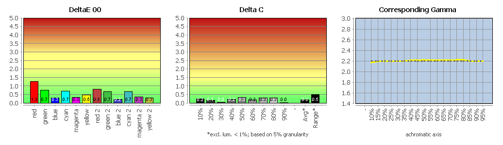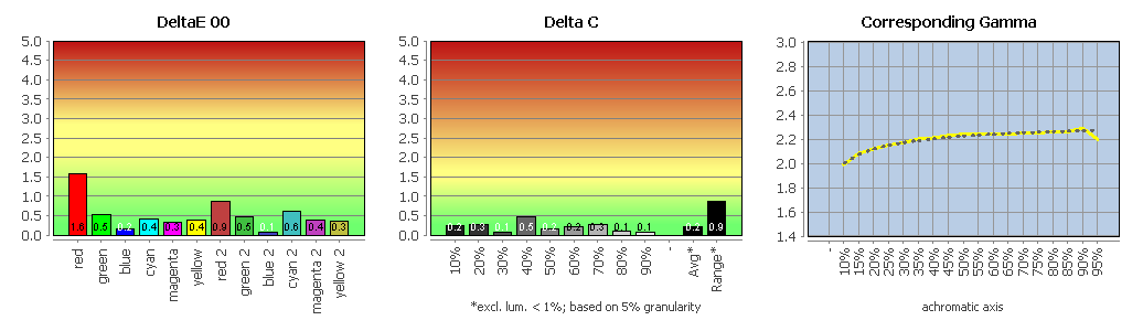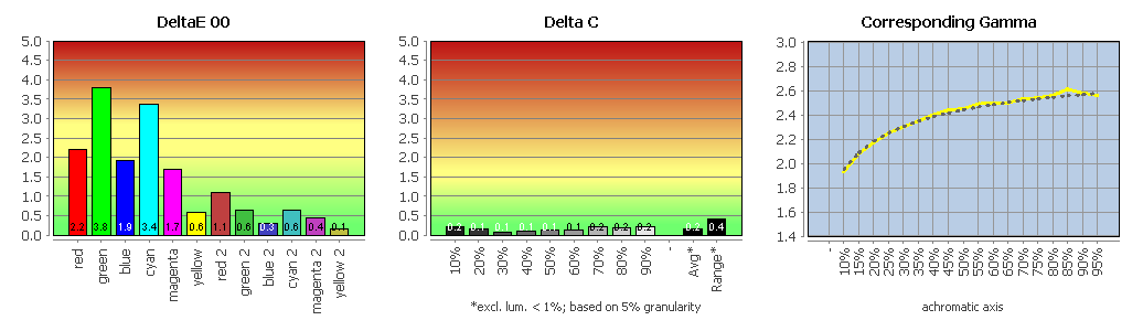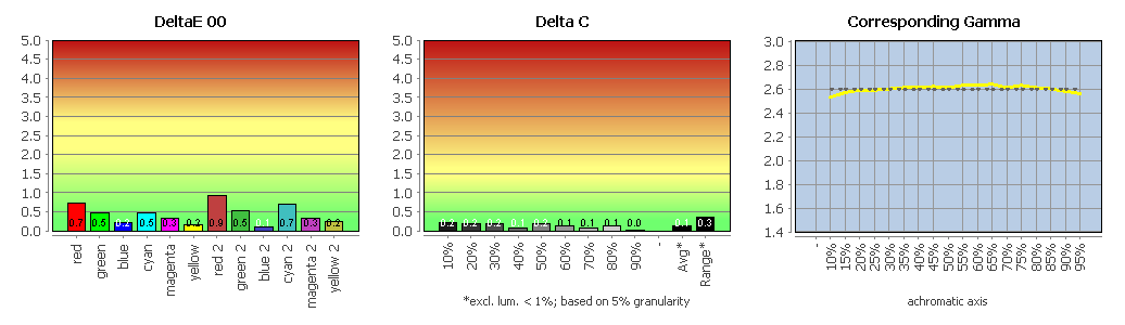 Der EIZO CG3100X zeigt keine auffälligen Drifts oder unschönen Nichtlinearitäten. Das Matrix-Profil beschreibt seinen Zustand sehr exakt. Eine Wiederholung der Profilvalidierung nach 24 Stunden ergab keine signifikant erhöhten Abweichungen. Alle Kalibrierungssziele wurden erreicht. Die Graubalance und die Farbwerte sind sehr gut.