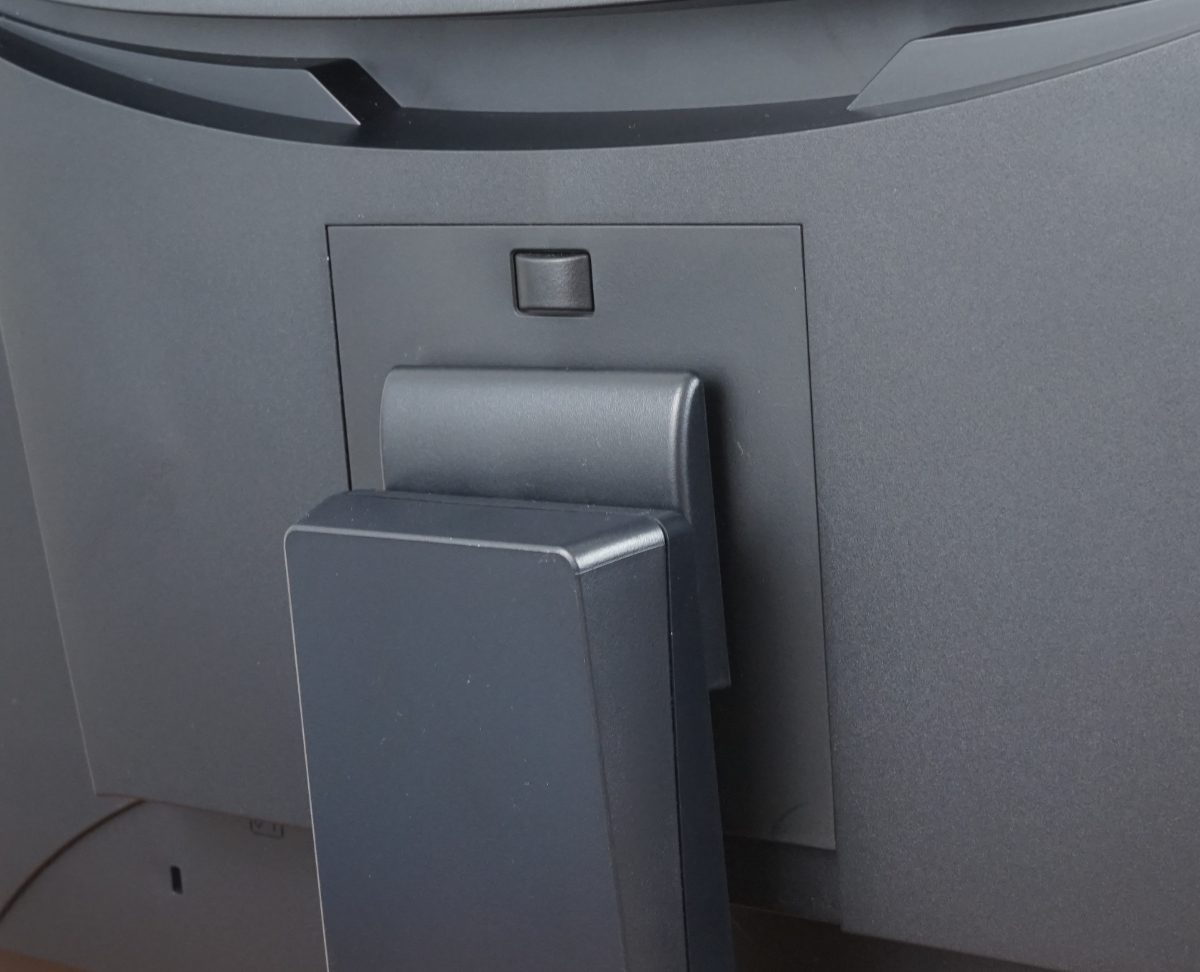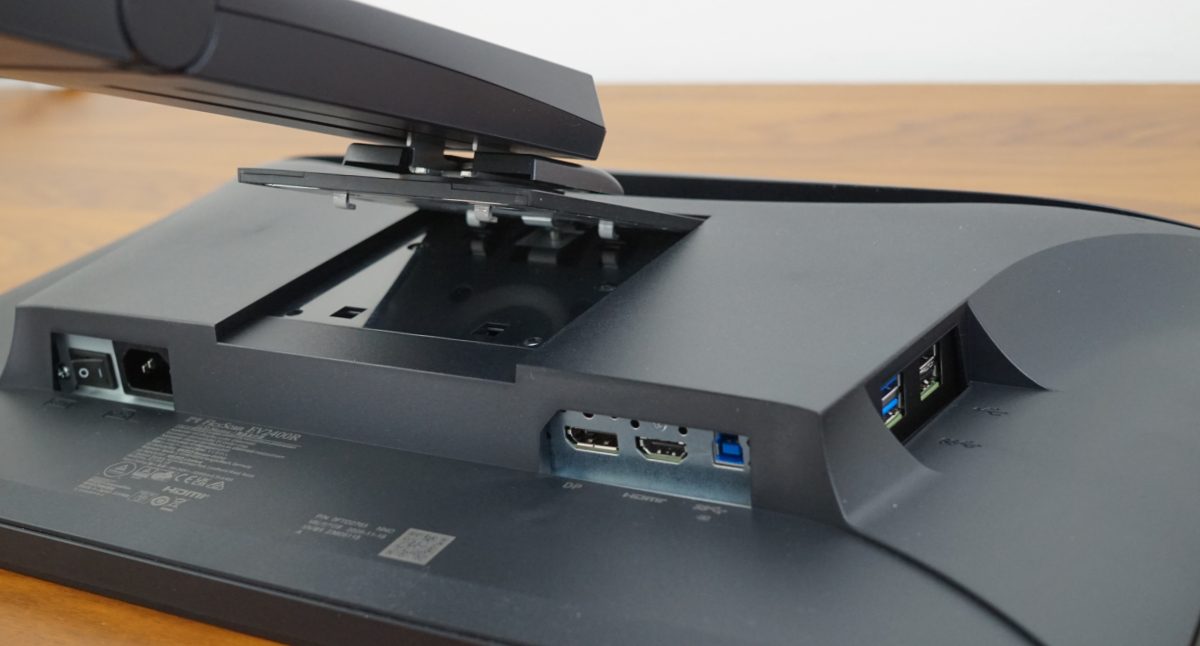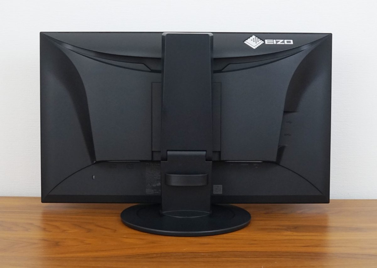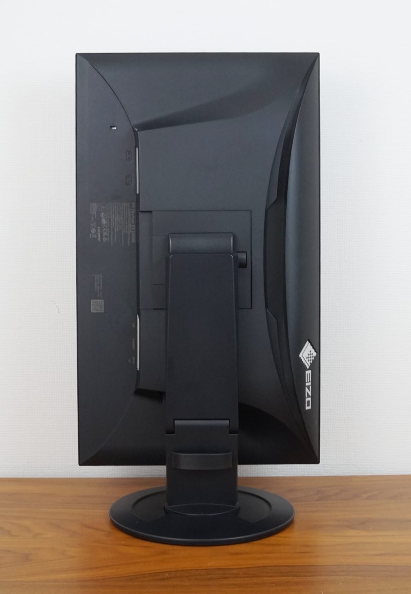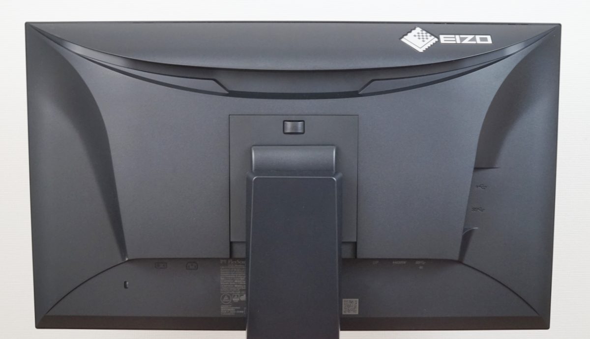 Der EIZO EV2400R verfügt über ein fest im Gehäuse verbautes Netzteil und einen eigenen Netzschalter, mit dem sich das Gerät vollständig vom Stromnetz trennen lässt. Trotzdem kommt der Monitor ohne sichtbare Lüftungsschlitze aus – selbst in der charakteristischen, sanft geschwungenen Mulde oberhalb der Standfuß-Aufhängung sind keine Lüftungsöffnungen erkennbar. Diese Mulde ist primär als Designelement gestaltet, bietet aber zugleich eine praktische Funktion: Sie erleichtert den Transport des Geräts und unterstützt die Handhabung bei der Nutzung der ergonomischen Verstellmöglichkeiten.