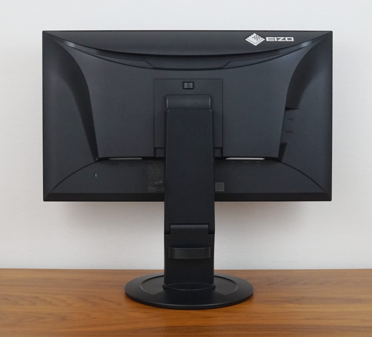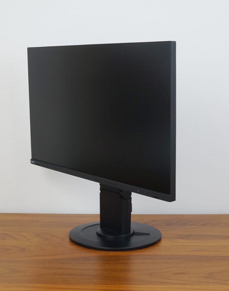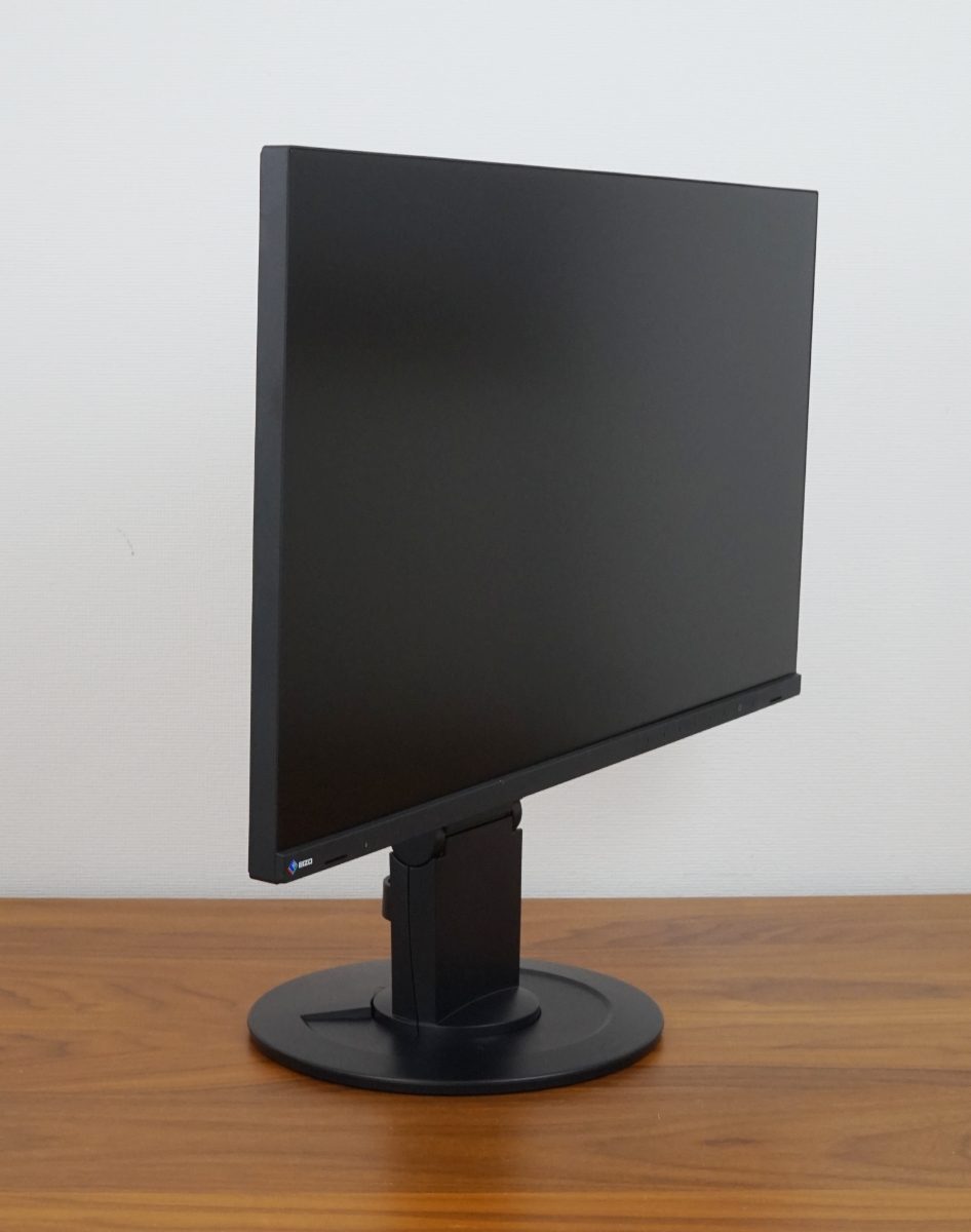 Der Standfuß hat einen Durchmesser von 23 cm. Die minimale Stelltiefe des EIZO EV2400R beträgt ca. 20 cm – gemessen vom hinteren Standfuß bis zum seitlichen Rahmen.