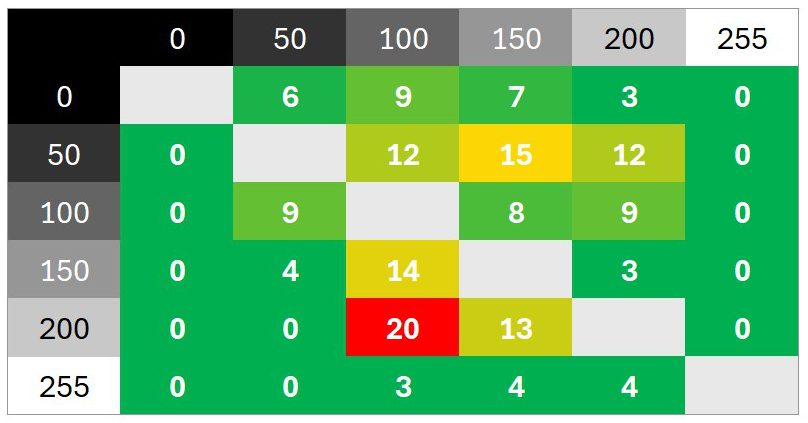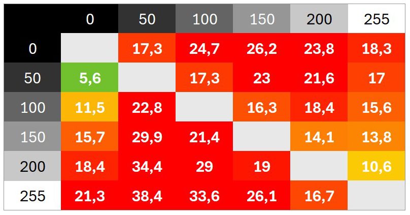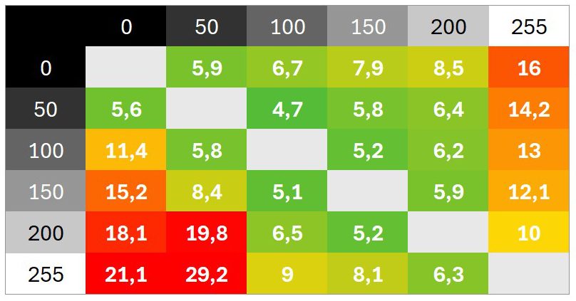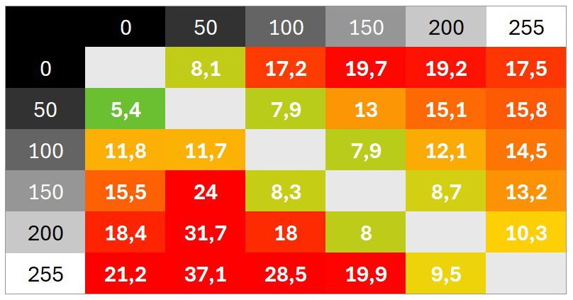 Überschwinger sind keine zu beobachten, die Abstimmung ist sehr neutral. Das Schaltzeiten-Diagramm zeigt unter anderem, wie sich verschiedene Helligkeitssprünge addieren und wie schnell der Monitor in der Werkseinstellung im besten Fall reagiert.