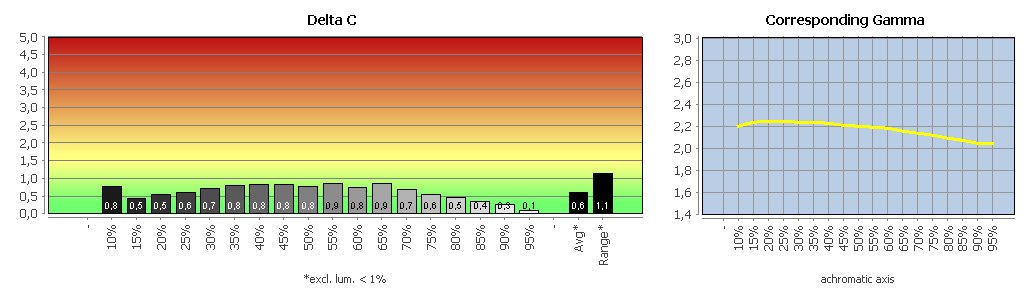 Im sRGB-Modus setzt sich das positive Bild fort. Die Graubalance ist nach wie vor einwandfrei, und die sRGB-Tonwertkurve wird annähernd erreicht. Das ist in diesem Segment selten. Geringe Abweichungen in den bunten Farben legen zudem Zeugnis von einer Farbraumtransformation ab.