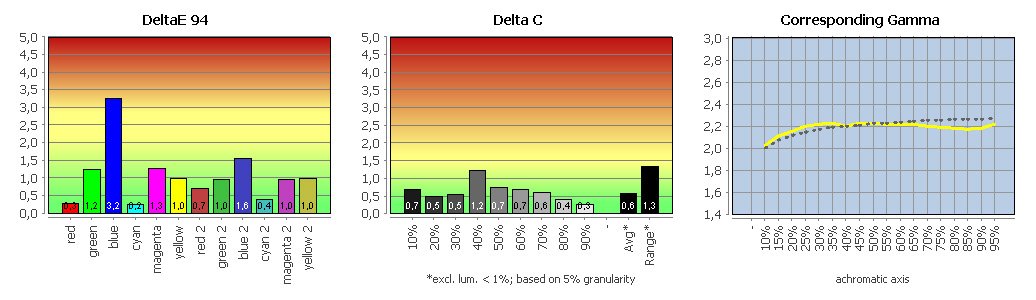 Der erzielte Farbumfang erlaubt farbsicheres Arbeiten im sRGB-Arbeitsfarbraum. Größere RGB-Arbeitsfarbräume werden nicht hinreichend abgedeckt. Einschränkungen ergeben sich auch im Rahmen der Proof-Simulation. Hier können nur kleinere Farbumfänge, wie sie beispielsweise im Zeitungsdruck (wird von sRGB vollständig eingeschlossen) anzutreffen sind, hinreichend reproduziert werden.