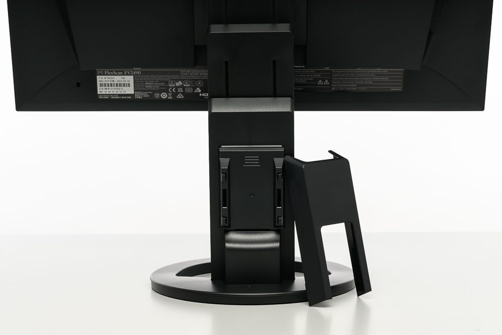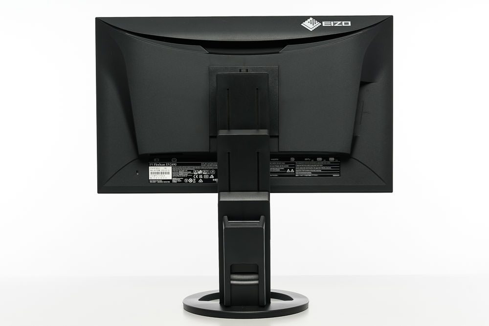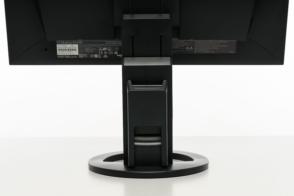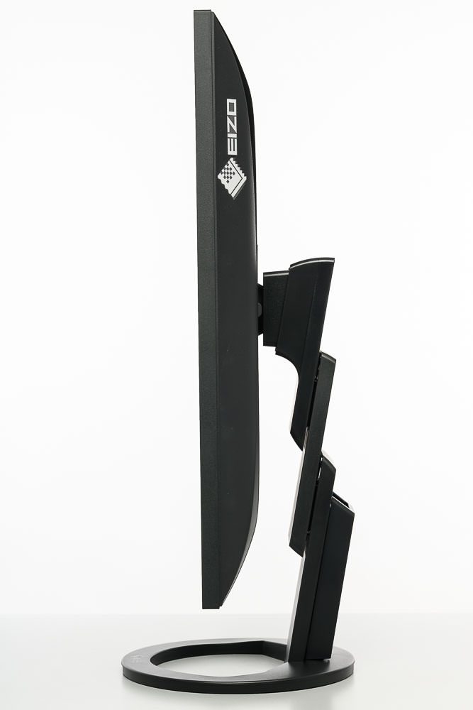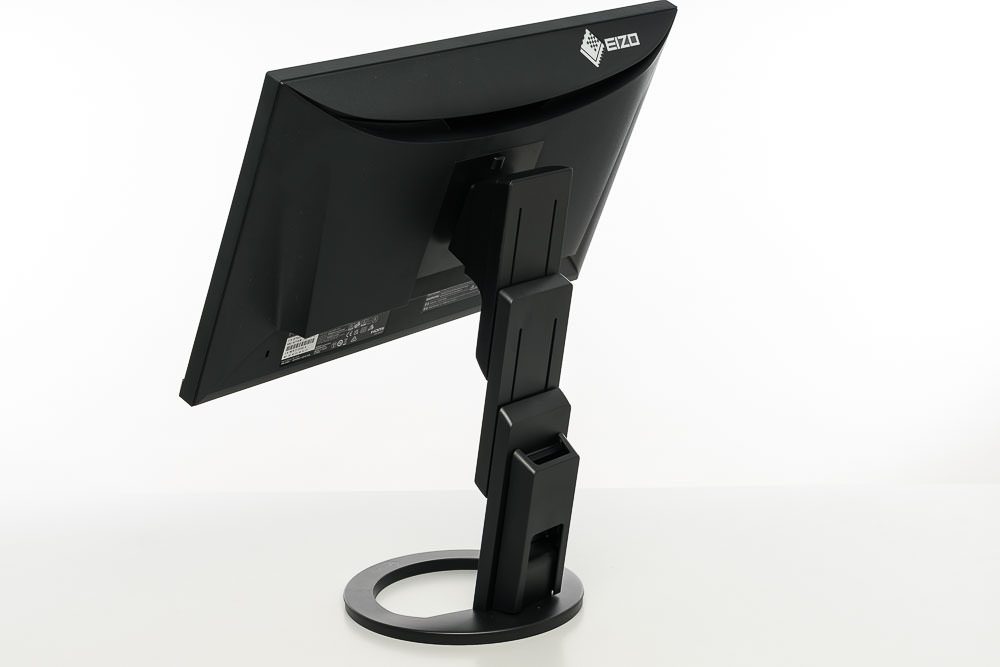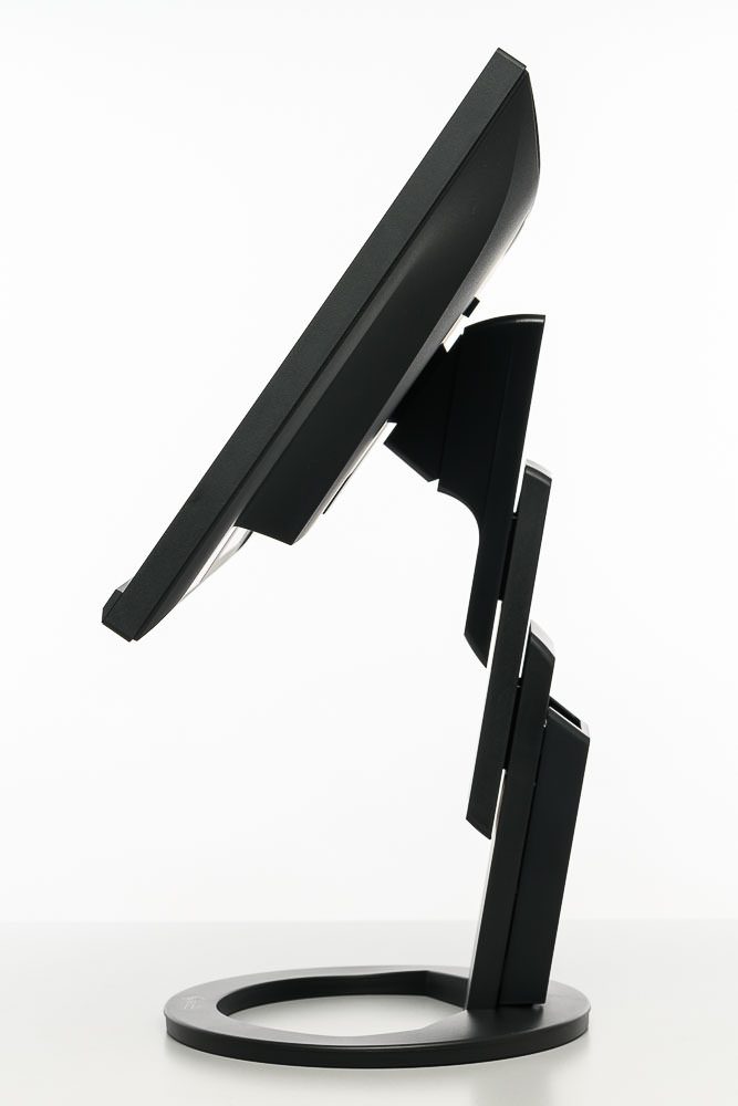 Die zweistufige Konstruktion des Standbeins ist ebenfalls identisch zu den neueren EV-Modellen. Sie ermöglicht eine ungewöhnlich großzügige Höhenverstellung um 18 cm. Das Display lässt sich dabei auch komplett bis auf den Drehteller absenken. Mit insgesamt 344° kann der EIZO EV2490 nahezu vollständig um die eigene Achse gedreht werden. Die Neigung fällt mit -5 bis +35° ebenfalls sehr großzügig aus.