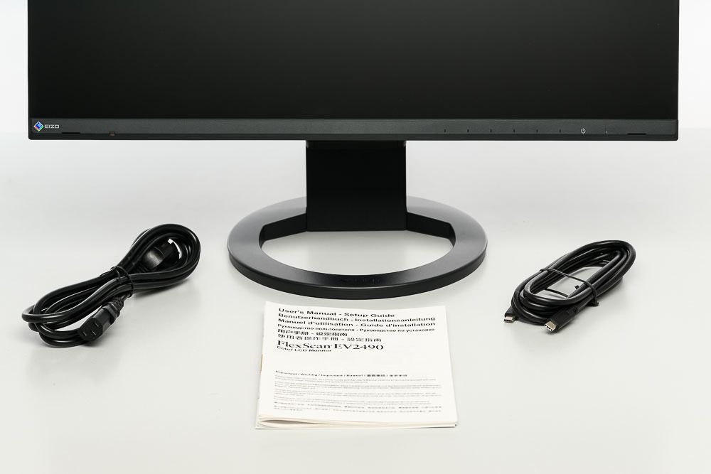 Der Verpackung des EIZO EV2490 fällt im Vergleich zum gleich großen EV2480 deutlich schlanker aus. Dafür steht das Gerät allerdings nicht mehr komplett vormontiert im Karton.