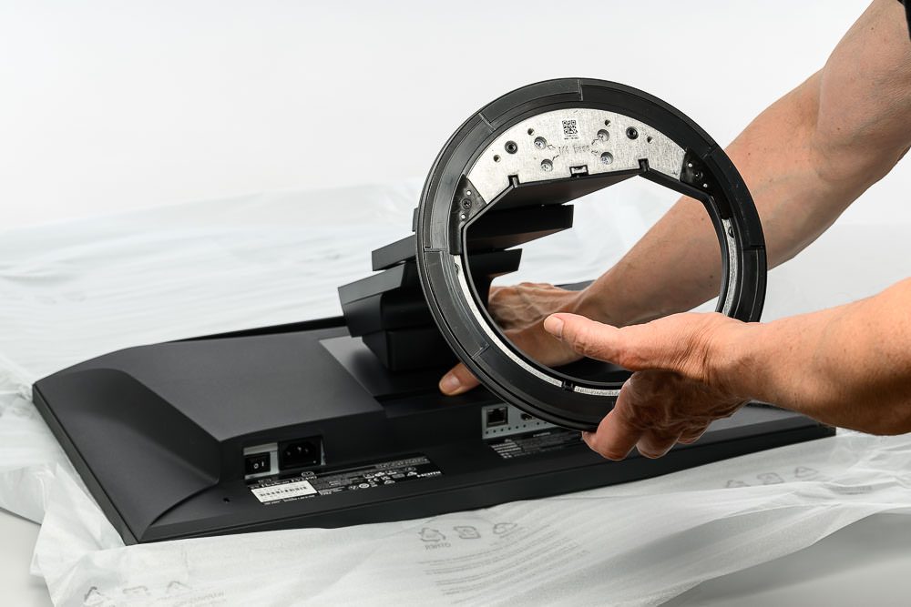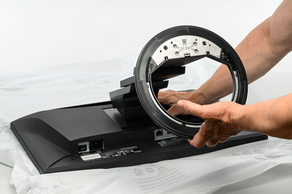 Zur Montage muss man lediglich das Display und das Standbein „enthüllen“ und dann das Standbein auf der Display-Rückseite einrasten lassen. Das Standbein wird dabei nicht – wie bei vielen anderen Geräten – leicht schräg, sondern weitgehend plan angesetzt und dann nur noch etwas nach oben geschoben. Per Knopfdruck kann es jederzeit auch wieder entfernt werden. Das Standbein und der Drehteller sind bereits vormontiert.