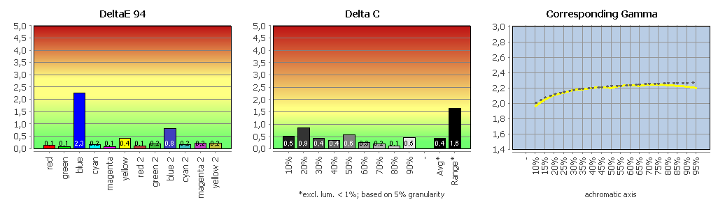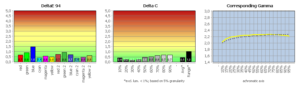 Auffällig ist lediglich die etwas höhere Abweichung bei Blau (Delta-E94-Maximum: 2.44). Das liegt vor allem daran, dass die anderen Werte so extrem gut sind (Delta-E94-Average: 0.36). Insgesamt ist das Ergebnis bei den Farbwerten wie auch bei der Graubalance gut bis sehr gut.