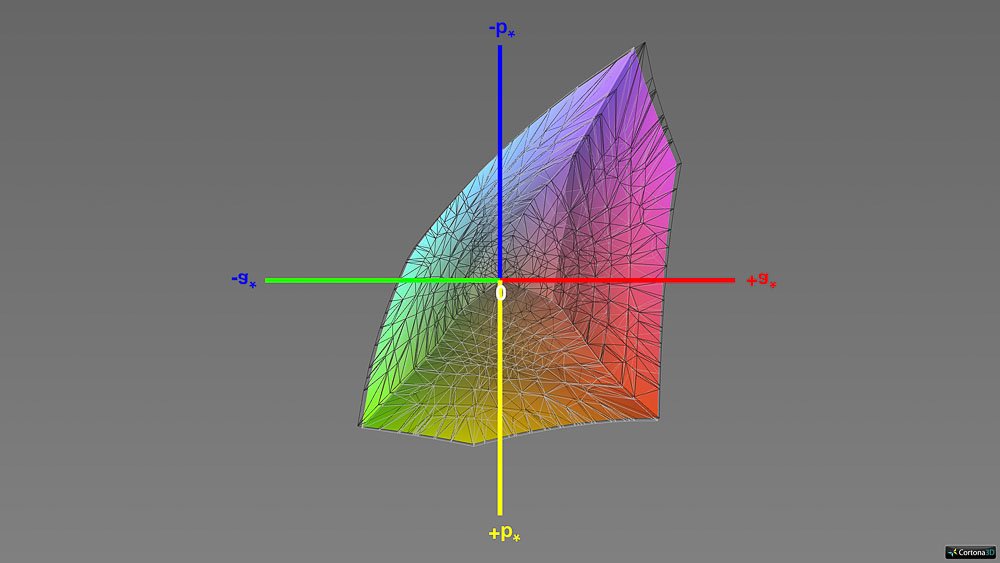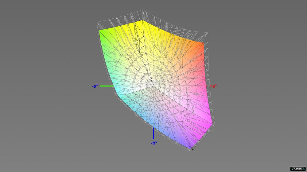 Der sRGB-Farbraum wird auch – wie vom Hersteller angegeben – praktisch vollständig abgedeckt. Der native Farbraum geht aber noch merklich darüber hinaus, was man insbesondere an einem kräftigen Rot erkennt. Für einen Büromonitor ist der etwas größere Farbraum eher ein Plus, da das Arbeiten mit kräftigeren Farben mehr Spaß macht.