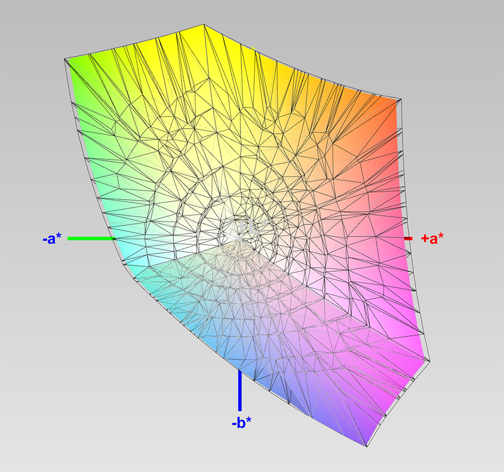 Zur Farbraumabdeckung verspricht EIZO beim EV3240X 100 % sRGB. Die nachfolgenden Grafiken zeigen die Farbraumabdeckung im User1-Modus (6500 K) nach der Software-Kalibration. Es ist deutlich erkennbar, dass der sRGB-Farbraum zu 100 % abgedeckt wird. Allerdings geht der Farbumfang stark über den sRGB-Farbraum hinaus. Ein fehlender Farbumfang wird durch ein schwarzes Gitter gekennzeichnet, eine größere Abdeckung durch ein hellgraues Gitter.
