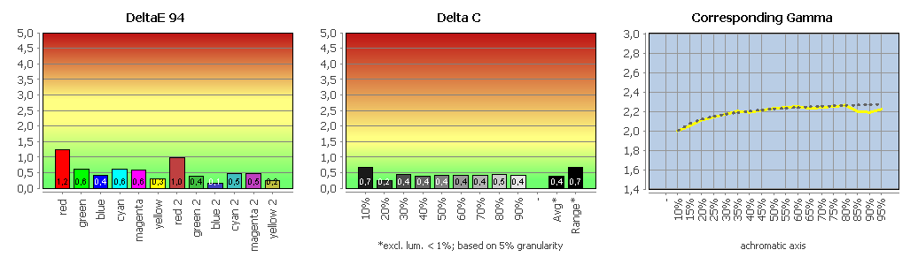Die Erläuterungen zu den folgenden Charts haben wir für Sie zusammengefasst: Delta-E-Abweichung für Farbwerte und Weißpunkt, Delta-C-Abweichung für Grauwerte, und Gradation.