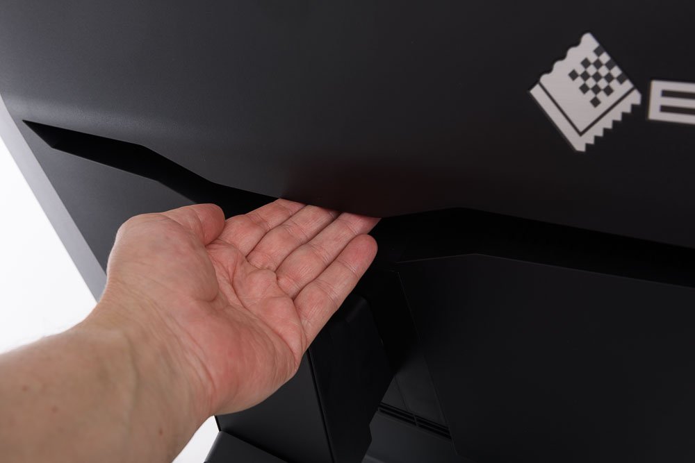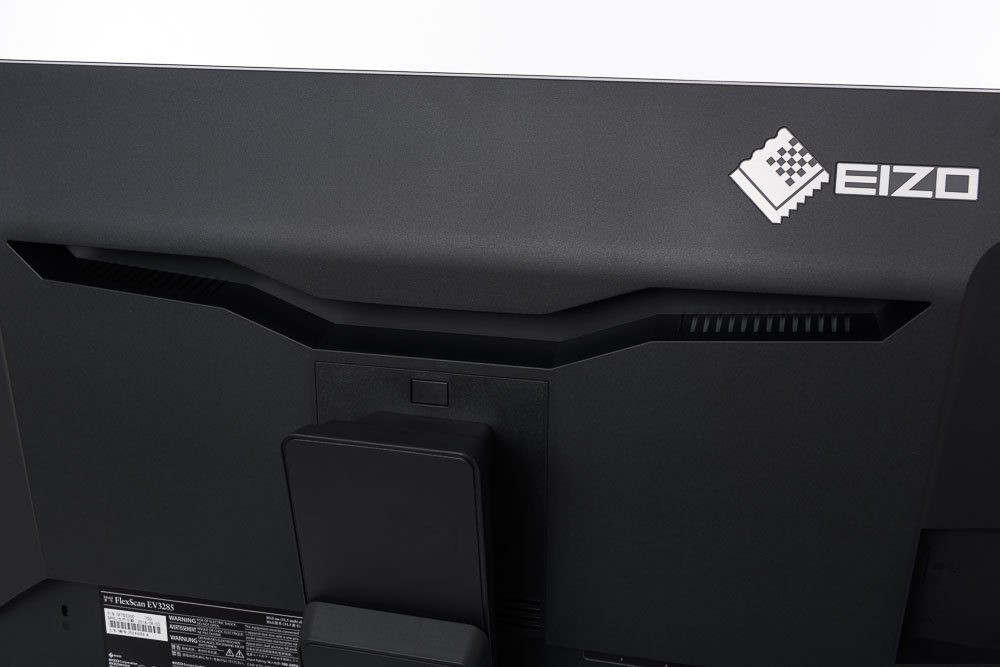 Die Stromversorgung wurde beim EV3285 ins Gehäuse integriert und hat genug Leistung, um über die USB-C-Verbindung auch externe Geräte mit bis zu 60 Watt zu versorgen. Zur passiven Kühlung ist auf der Rückseite ein Erker mit Lüftungsschlitzen eingelassen, der auch optisch einen netten Akzent setzt. Im normalen Display-Betrieb konnten wir im Bereich der Lüftungsschlitze nur eine minimale Erwärmung feststellen. Eine leichte, aber deutlich spürbare Erwärmung fanden wir in einem etwa handflächengroßen Bereich rechts neben der Standbeinbefestigung.