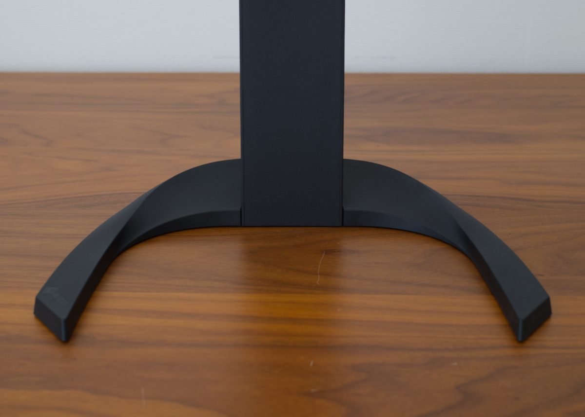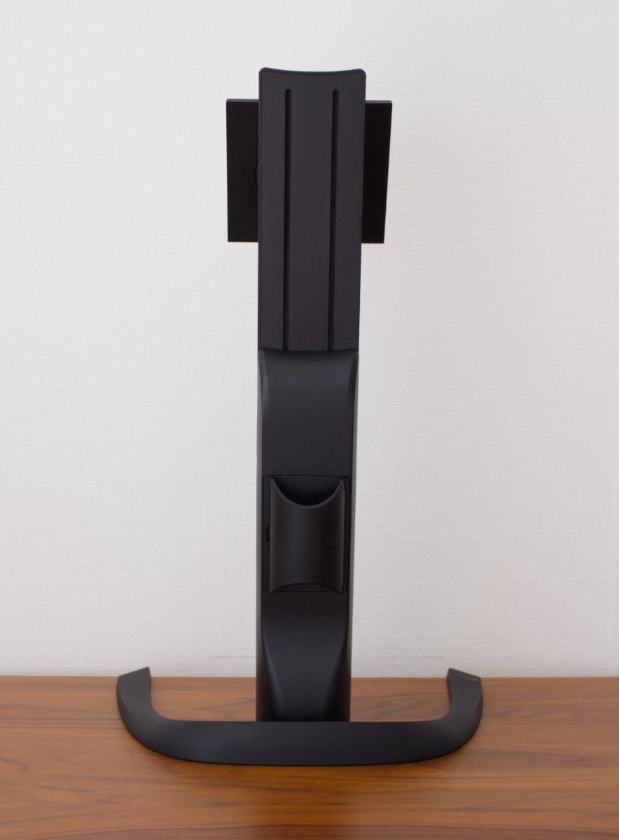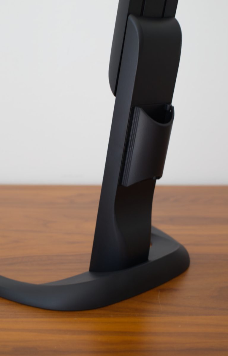 Der Bildschirm muss noch mit dem Standbein verbunden werden. Zuerst werden der Arm und der Standfuß montiert. Dies geschieht werkzeuglos mit zwei Flügelschrauben. Um das Display stabil an seinem Platz zu halten, ist an der Unterseite des Standfußes eine Gummierung angebracht, und zwar nicht punktuell, sondern seitlich umlaufend. Dadurch wird ein Verrutschen des Monitors bei seitlicher Drehung wirksam verhindert und eine sichere und bequeme Einhandbedienung ermöglicht. Das Verschieben auf dem Schreibtisch wird dadurch zwar etwas erschwert, aber in der Regel bleibt der Bildschirm nach dem ersten Ausrichten an seinem Platz.