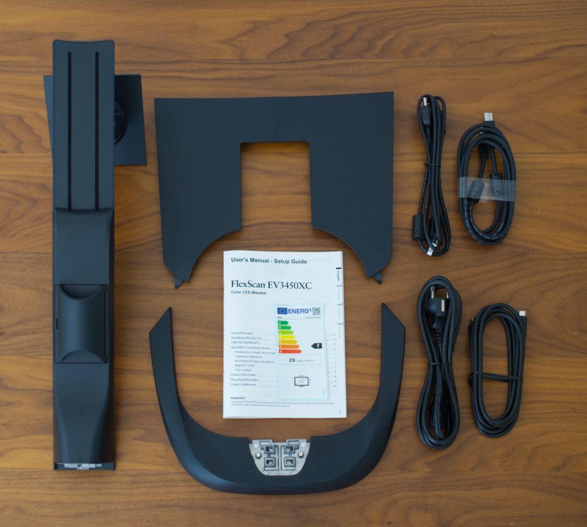 Im Karton befinden sich neben dem Monitor selbst der Standfuß, das Standbein, eine Kabelabdeckung sowie je ein Kabel für DisplayPort, USB-C, USB-A auf USB-B und Strom. Außerdem liegen eine Broschüre mit Sicherheitshinweisen, eine Montageanleitung für das Standbein, eine Kurzanleitung zur Inbetriebnahme und ein Energielabel der Klasse F bei.