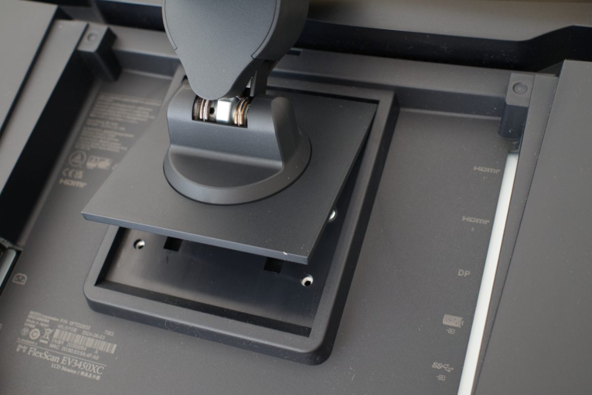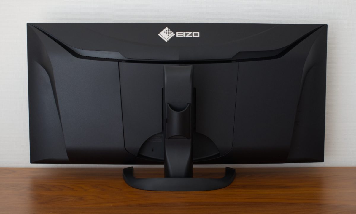 Beim EIZO EV3450XC ist das Netzteil im Gehäuse integriert und verfügt über einen separaten Netzschalter, sodass das Gerät komplett vom Stromnetz getrennt werden kann. Lüftungsschlitze befinden sich auf der Rückseite unterhalb des EIZO-Logos. Eine Erwärmung der Rückseite tritt nur geringfügig auf.